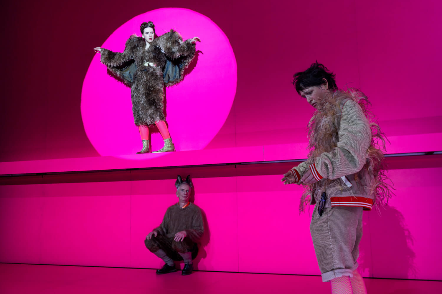 Grandios sind die Kostüme von Juliane Kalkowski. Sie halten die poetische Balance zwischen Tierrolle und Menschen-Allegorie und geben dem grandiosen Dreier-Ensemble Freiheit und zugleich Form fürs Spiel. Auch Kathrin Froschs Bühne überzeugt. Zunächst ein enger pinker Raum für die Adler-Sippe, der sich nach dem Fall der Rückwand fürs zweite Drama „Nullipara Kolibri“ öffnet und einen Blick auf eine erst blühende, am Ende luftlos-schlaffe Vulva-Blüte bietet. Das Drama mäandert trickreich, und etwas ziellos um die Krankenhaus-Misshandlung der sterilisierungssuchenden Kolibri-Dame Frau Pétain, um die die präpotente Chefärztin Dr. Februar (Natali Seelig) und den unsicheren, unzufriedenen Assistenen Herr Titsch (Bernd Moss).