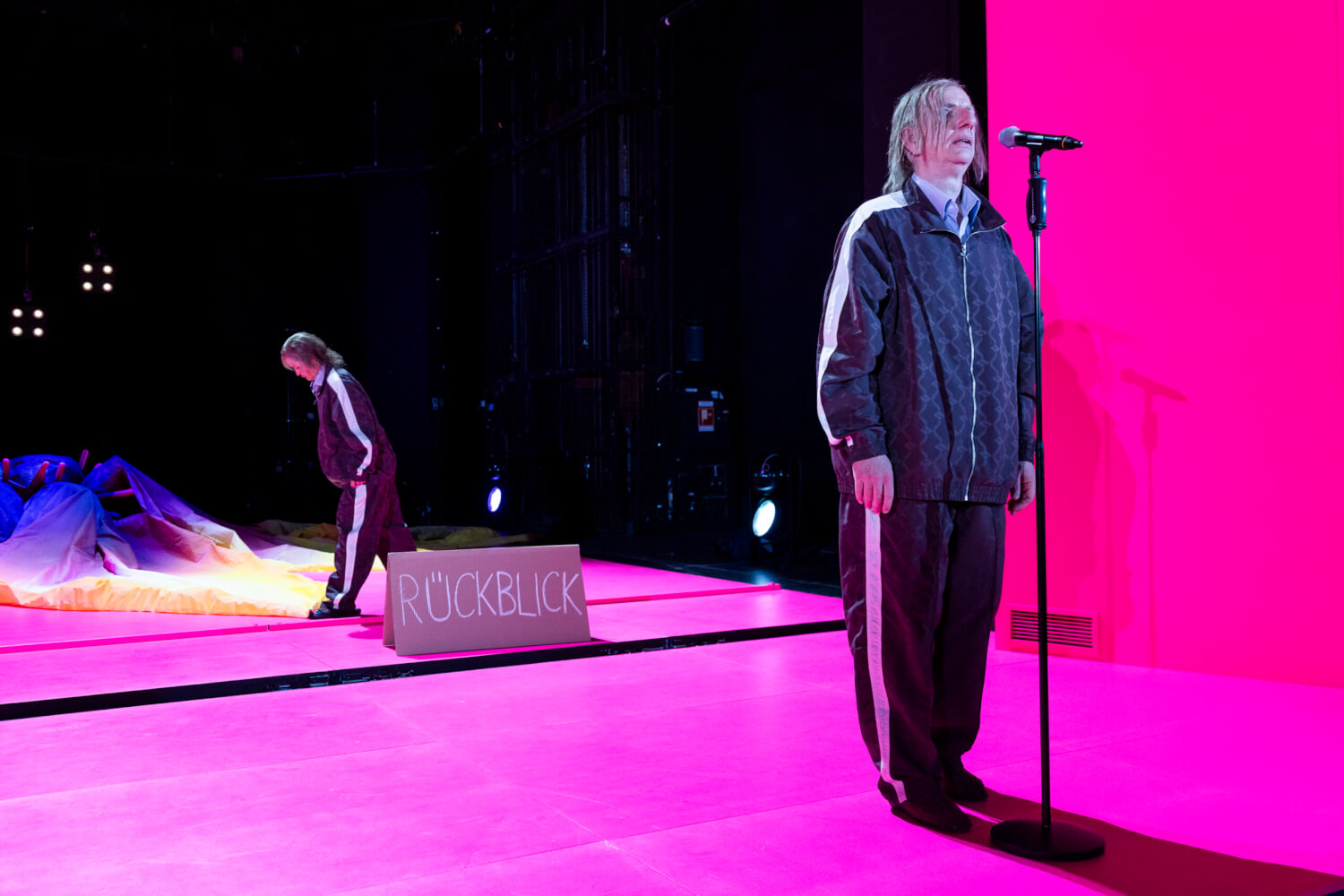 In Jorinde Dröses Uraufführung von „Bookpink: New Arrivals“ beginnt Bernd Moss – nach Ansage der normalerweise vom Band kommenden Handywarnhinweise des Theaters – im pelzigen braunen Pullover den Vorbericht, dann gesellt sich Natali Seelig zu ihm, es bildet sich ein Vogel-Duo, das bald ins erste Minidrama überwechselt: In „Die Adler“ spielt Daria von Loewenich die dominante, skrupel- und fast mitleidslose Mama, während Natali Seelig den zerrupften, pubertierenden Sohn gibt und Bernd Moss den Schäferhund namens Success, der sich zwischen Herren und Kiff-Kumpel in seinen Loyalitäten aufreibt.