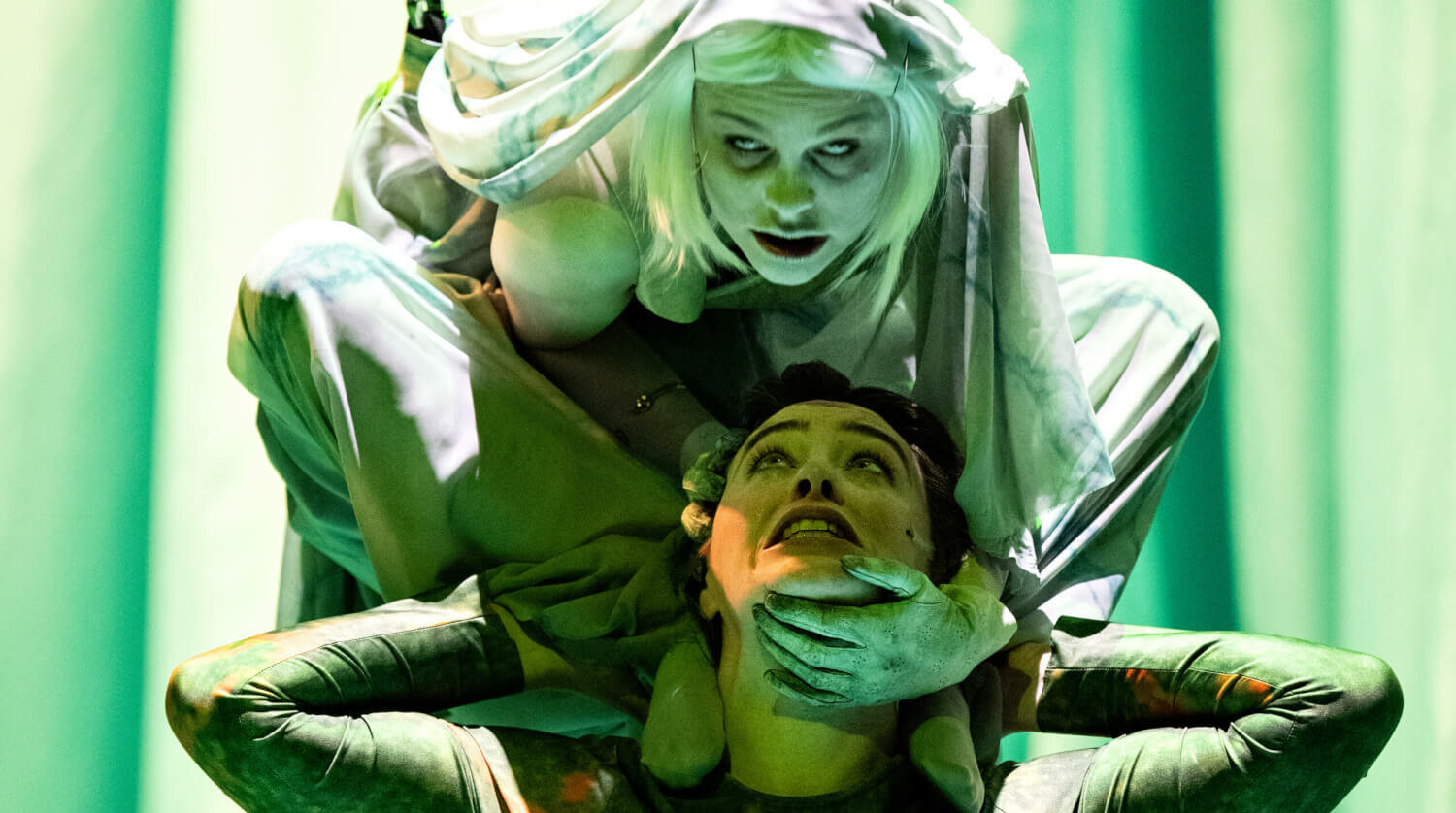 Der in Bosnien geborene und in Kroatien aufgewachsene Oliver Frljic gilt als einer der wichtigsten politischen Regisseure der europäischen Theaterszene, der sich durch seine packenden Zugriffe von Stücken und Stoffen auszeichnet. Ein solcher Zugriff ist ihm nun auch bei Shakespeares „Romeo und Julia“ gelungen. Wenn der Vorhang sich hebt, stehen sich Tybald (David Müller) und Romeo gegenüber mit den Texten aus der berühmten Erkenntnisszene zwischen Romeo und Julia. Mit einem Schlag ist die ganze Genderdebatte ins Bild gefasst. Beide umarmen sich, ziehen sich aus und trennen sich gar nicht mehr zärtlich, als Romeo gesteht, dass er eine Frau liebt. Das Spiel zwischen zärtlichem Angezogen- und aggressivem Abgestoßensein, auch das ein Motiv, das sich durch die gesamte Inszenierung zieht. Dann werden Grabsteine in den Raum gerollt, zwei schlichte Holzsärge hereingetragen. Im Halbdunkel huschen dunkle Gestalten herum, und Pater Lorenzo (Thomas Meinhardt) fasst kurz die Rolle, die er in dieser Geschichte spielt, zusammen. Dann trägt auf einem hohen Gestell Sandra Hartmann „Killing me softly“ vor, Rauch quillt, Discobeleuchtung, kurz, das ist das Fest, bei dem sich die beiden kennenlernen. Und im Hintergrund bleibt im Dunkel der Friedhof zu sehen.