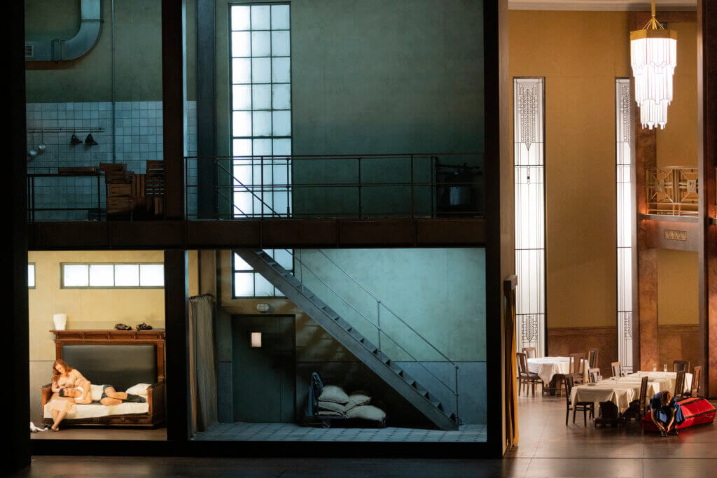 Vasily Barkhatov (Regie), Zinovy Margolin (Bühne) und Olga Shaishmelashvili (Kostüme) haben die Geschichte an die Entstehungszeit der Oper herangerückt und mit einer opulenten Ausstattung versehen. So etwas wie sowjetischen Jugendstilanklang in einem üppigen Festsaalhalbrund. Mit einer Galerie, die sich aus dem Bild drehen kann und auf der eine ganze Polizeistation Platz hat, wenngleich die in ihren weißen Uniformen weniger nach grotesker Staatsmacht, sondern mehr nach Kulturprogramm aussehen. Aber die Musik dazu reißt das raus und das Publikum mit. Dazu gibt es eine von der Seite hereinfahrbare zweistöckige Bühne, in der sich unten der Wohn- und Büroraum und oben eine Großküche finden. Den übergriffigen Schwiegervater lässt Katerina im Speisesaal triumphierend verrecken, ihr Ehemann wird auf dem Sofa kurzerhand gewürgt und dann erstickt und im Tresor verstaut.