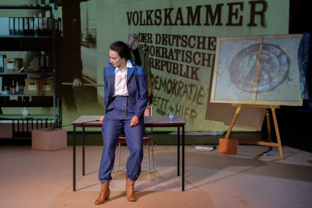 Für die intime Studiobühne am Deutschen Nationaltheater Weimar hat Beate Seidel den Erfolgsroman „Kairos“ von Jenny Erpenbeck adaptiert und inszeniert. Die Affaire der jungen Katharina mit dem deutlich älteren Hans in Zeiten des Zusammenbruchs der DDR erzählt Seidel mit Verfremdung und epischer Distanz – und bewegt das Publikum trotzdem.